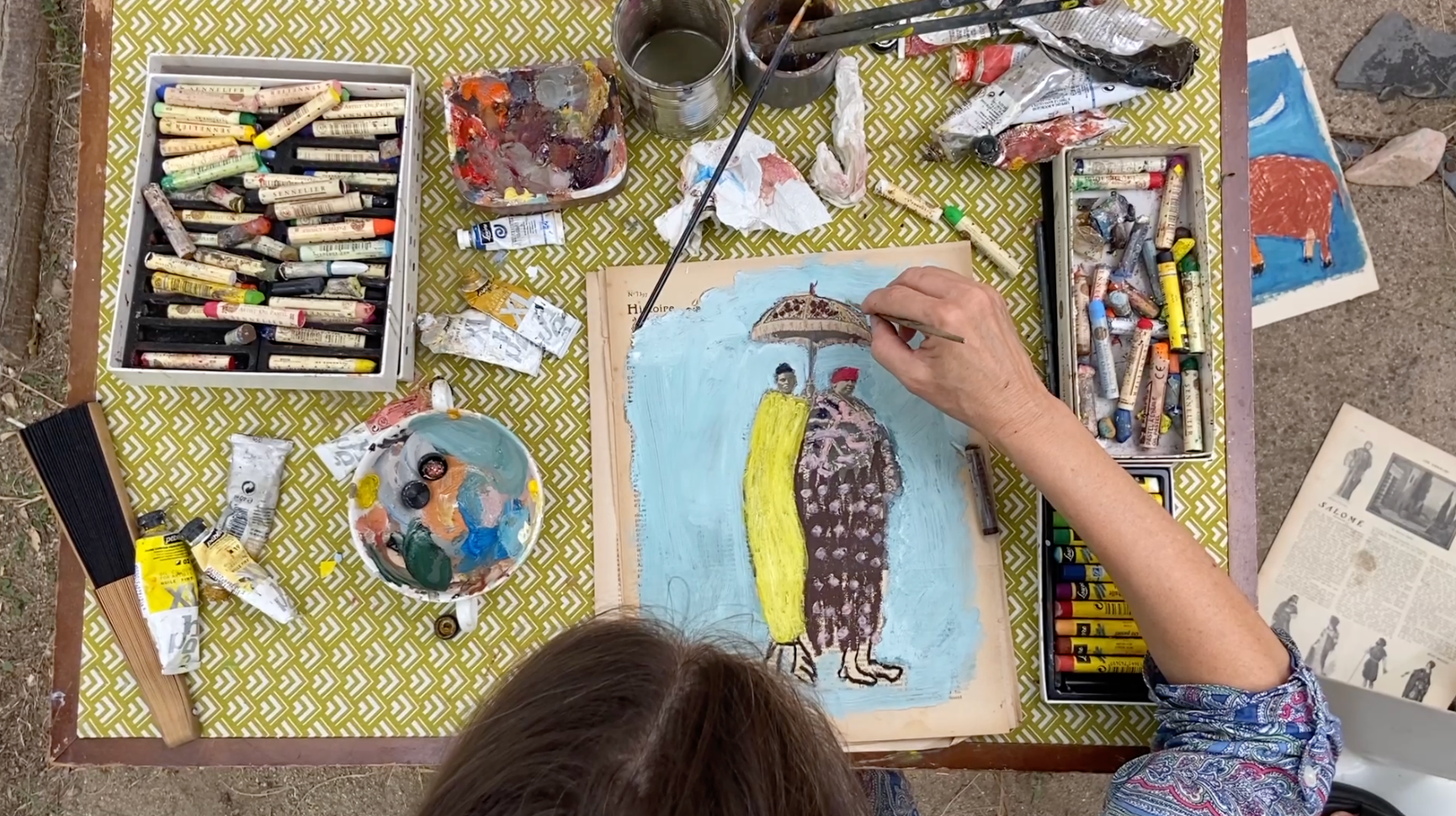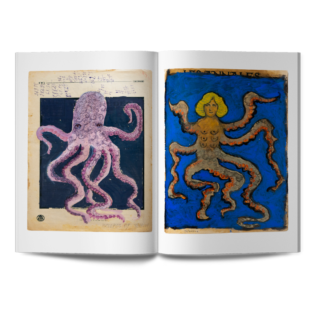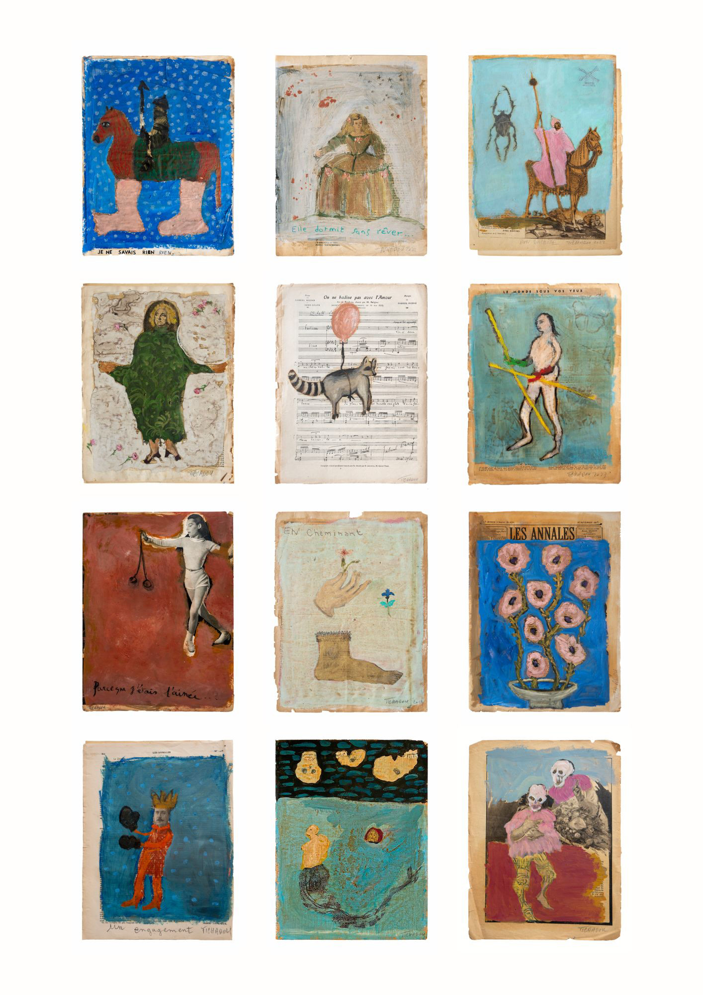 C’est un été en 2019 que l’artiste peintre Corinne Tichadou déniche dans une brocante un lot d’annales datant de 1920. Aussitôt, elle est happée par la texture et les couleurs surannées des brochures, la délicatesse de la typographie et le contenu décrivant la vie culturelle et politique de l’époque. En quelques coups de pinceaux, la série des Méditations est née. En peignant directement sur les journaux, Corinne Tichadou fait ressortir les figures existantes des feuillets. On y retrouve des personnages mythologiques, des scènes allégoriques, des anges, des vanités, des lutteurs, des sirènes, des scènes surréalistes, des animaux marins, des personnages fantastiques, des fleurs…